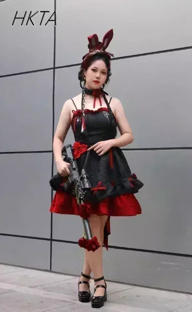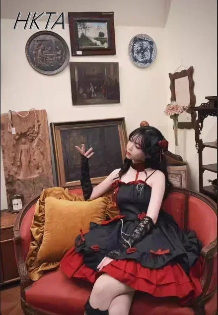 Embrace dramatic elegance with this Gothic Lolita Y2K JSK Dress — a stunning black and red masterpiece with romantic details, perfect for cosplay, birthdays, or living your dark princess dreams.