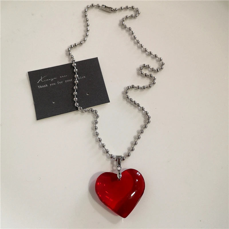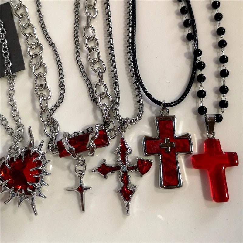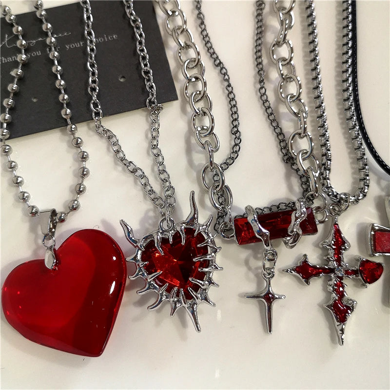 Gothic Red Heart Thorns Cross Chains Necklace – Hip-Hop Grunge Punk Y2K Jewelry for Women & Men