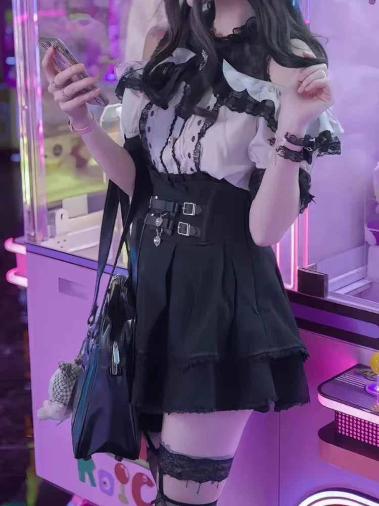 Japanese Gothic Lolita Dress Set – Harajuku Y2K Bow & Lace Mini Dress for Women