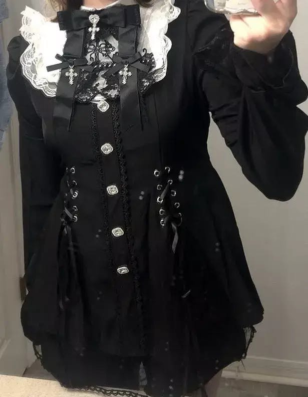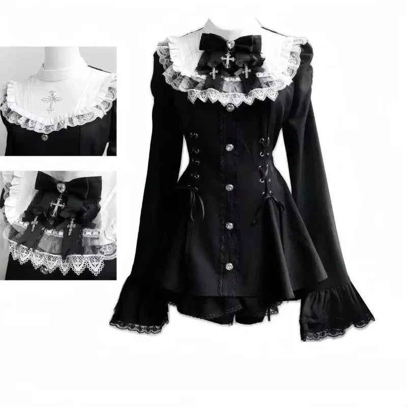 Gothic Lolita style with elegant collar, lace trim, and layered ruffles