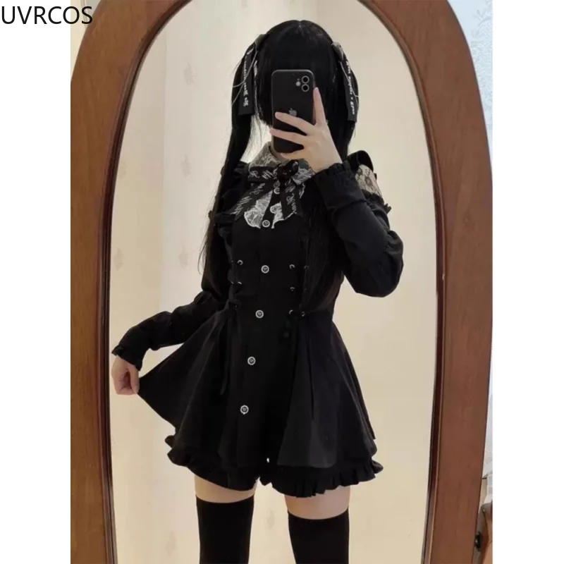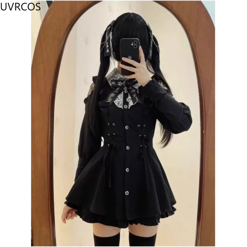 Bring kawaii darkness to life with this Japanese Gothic Style Dress & Shorts Set — a stunning blend of Lolita elegance, Y2K edge, and gothic glam featuring lace, rhinestones, and a playful bow accent.
